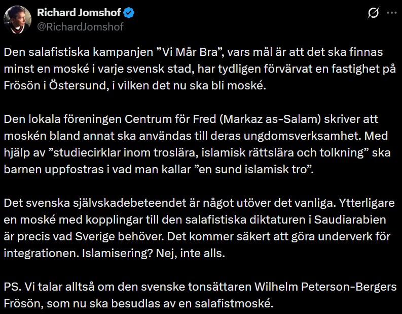 On December 3rd last year, a purchase agreement was signed for a property on Frösön in Jämtland. A fundraising campaign is underway to convert the building into a mosque, and behind the project stands an entity linked to a national Salafist campaign. Experts warn about the implications of this establishment.
